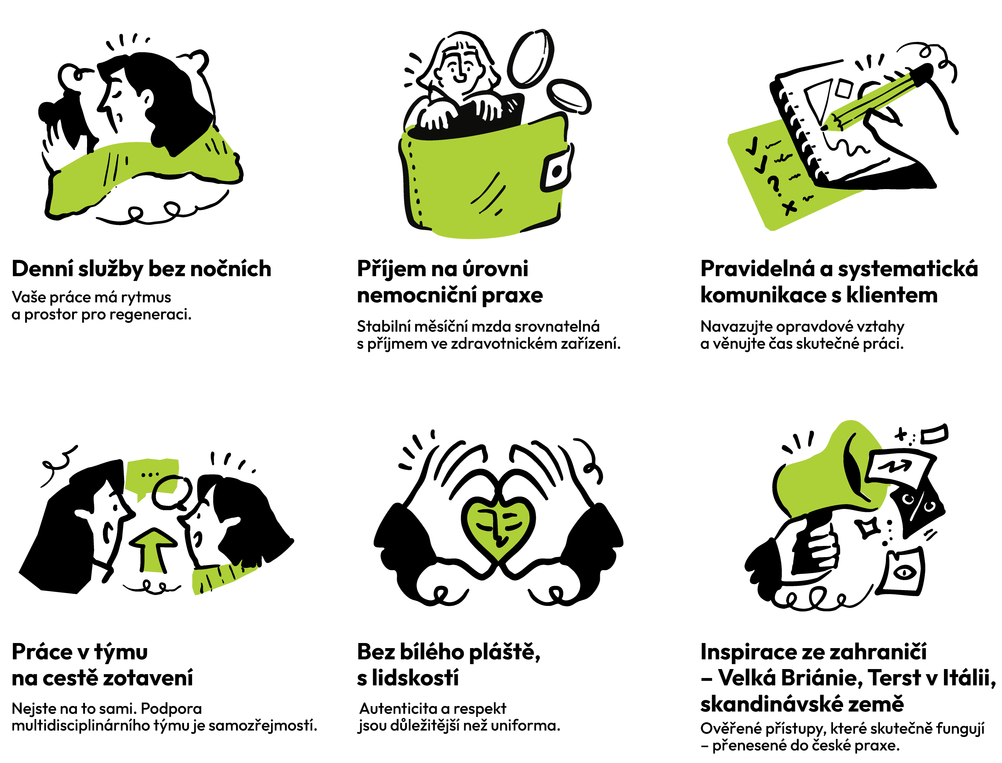 Pracovní doba je denní, zpravidla od 8:00 do 16:00. Kombinujete týmovou práci s individuálními setkáními s klienty v jejich přirozeném prostředí. Nejde o akutní péči, ale o dlouhodobou podporu.